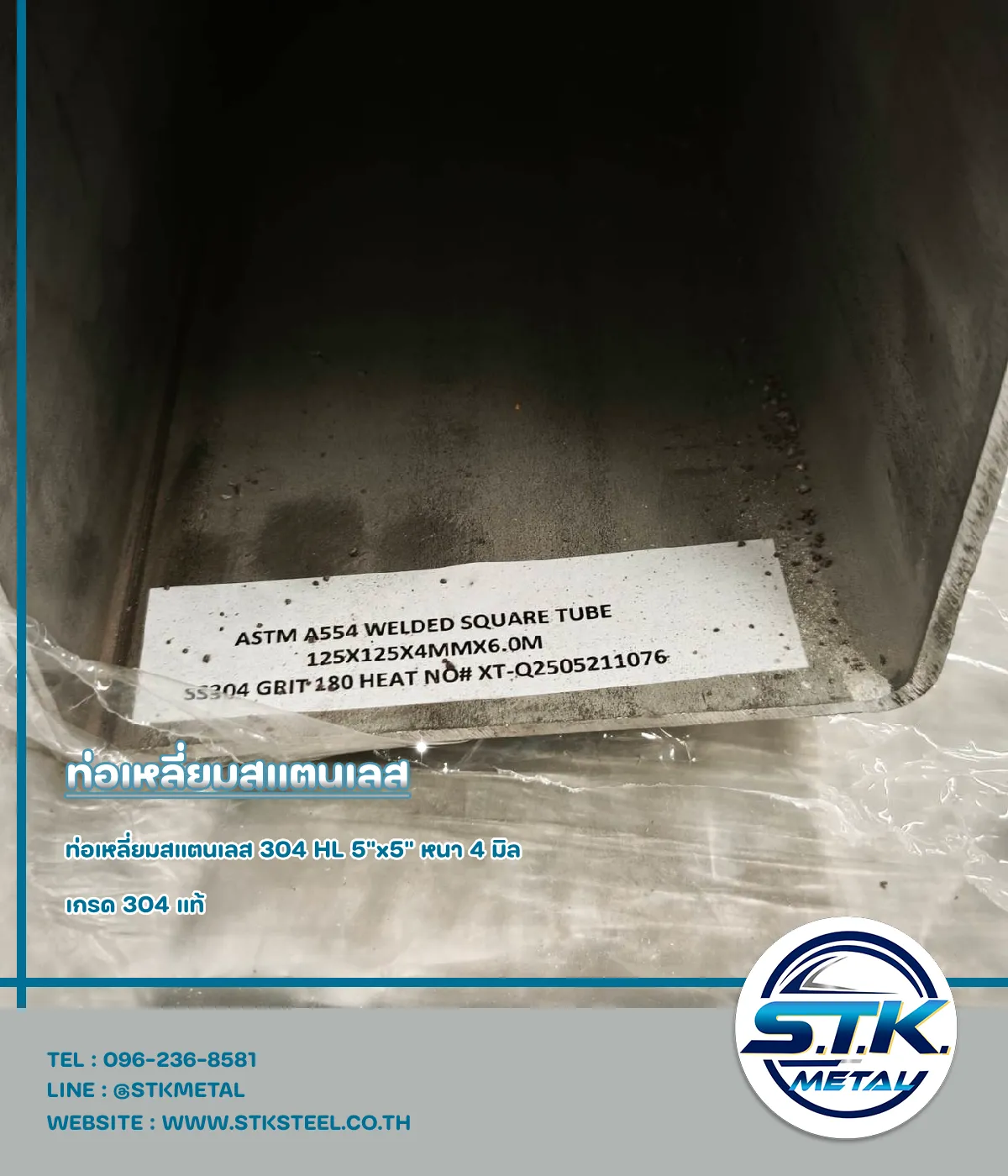 ท่อเหลี่ยมสแตนเลส 5x5 นิ้ว หนา 4.0 มิล เกรด 304 ผิว HL